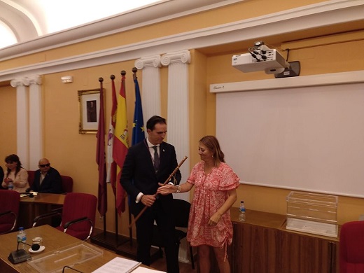 Guzmán Gómez Alonso recibiendo el bastón de mando de manos de la hasta ahora primera edil de la villa, Teresa López