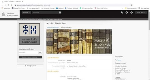 En este espacio virtual (Aplicación web ATOM) se pone a disposición del investigador la documentación del Archivo Simón Ruiz (B.I.C. desde 2017), del Archivo Municipal de Medina del Campo (Fondo Histórico), y del Archivo de la Fundación Museo de las Ferias. Se llega así a la última fase de los proyectos de digitalización, registro electrónico y acceso remoto, iniciados hace varios años: del AMMC desde 2014, en colaboración con la Cátedra Simón Ruiz de la Universidad de Valladolid; del ASR desde 2015, en colaboración con la Subdirección General de los Archivos Estatales del Ministerio de Cultura y Deporte; y del AFMF desde hace más de veinte años al constituirse la Fundación Museo de las Ferias. La relación de fondos ya publicados en el portal y las previsiones para 2021, pueden verse en la portada del mismo. La realización técnica de este proyecto ha sido coordinada por Álvaro Rodríguez Sarmentero, actualmente del Cuerpo Facultativo de Archiveros y Bibliotecarios.