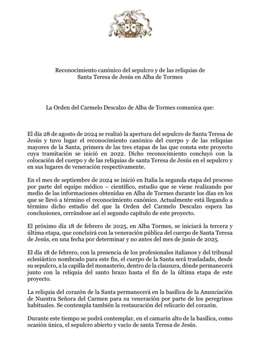 La Orden del Carmelo Descalzo ha anunciado que el proceso de reconocimiento canónico del cuerpo y las reliquias de Santa Teresa de Jesús entra en su fase final. A partir del 18 de febrero de 2025, su cuerpo será trasladado dentro de la clausura del monasterio en Alba de Tormes, permitiendo la veneración de los fieles hasta al menos junio de 2025.