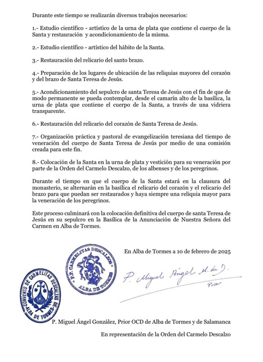 11-02-25 - El cuerpo de Santa Teresa se expondrá para su veneración en una fecha aún por determinar.