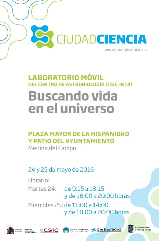 Medina del Campo, 18 de mayo de 2016. Un equipo de investigadores del Centro de Astrobiología (CAB), instituto mixto del Consejo Superior de Investigaciones Científicas (CSIC) y del Instituto Nacional de Técnica Aeroespacial (INTA), visitará Medina del Campo para explicar cómo evoluciona o se adapta la vida en condiciones extremas. A partir del martes, 24 de mayo, el camión de campaña del Centro de Astrobiología estará en la Playa Mayor de la Hispanidad. Allí los investigadores explicarán el equipamiento de este vehículo, así como la actividad científica que se realiza en las instalaciones del CAB y en los variados escenarios a los que acuden con el camión para hacer el trabajo de campo (río Tinto, Antártida, desierto de Atacama).