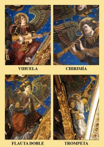 De todo el conjunto se han podido rescatar las pinturas de las plementerías, es decir, los doce ángeles músicos de cuatro metros cada uno sobre cielo azul estrellado. El detallismo y precisión de los instrumentos que tocan ha fascinado a luthiers de todo el mundo, que han creado copias con las que se dan conciertos y se realizan exposiciones. El conjunto valenciano de música antigua Capella de Ministrers ha grabado con ellos un disco (Música Angélica, 2006), lo que nos permite imaginar cómo sonaría aquella corte celestial de Rodrigo Borgia: https://www.youtube.com/watch?v=Zt2kTYeksxw